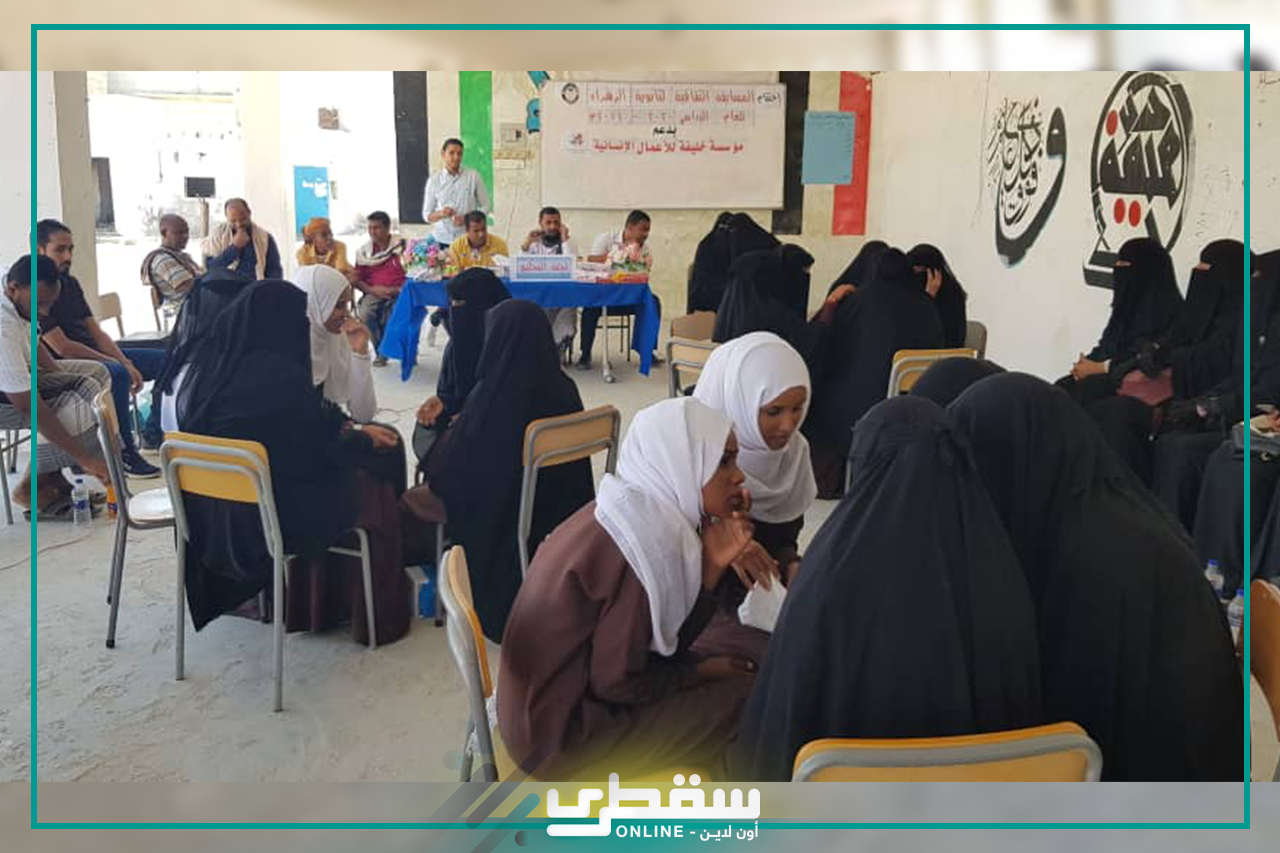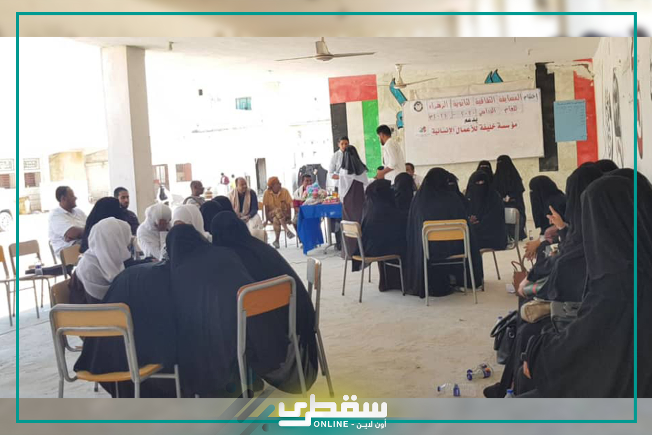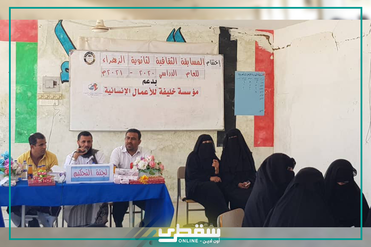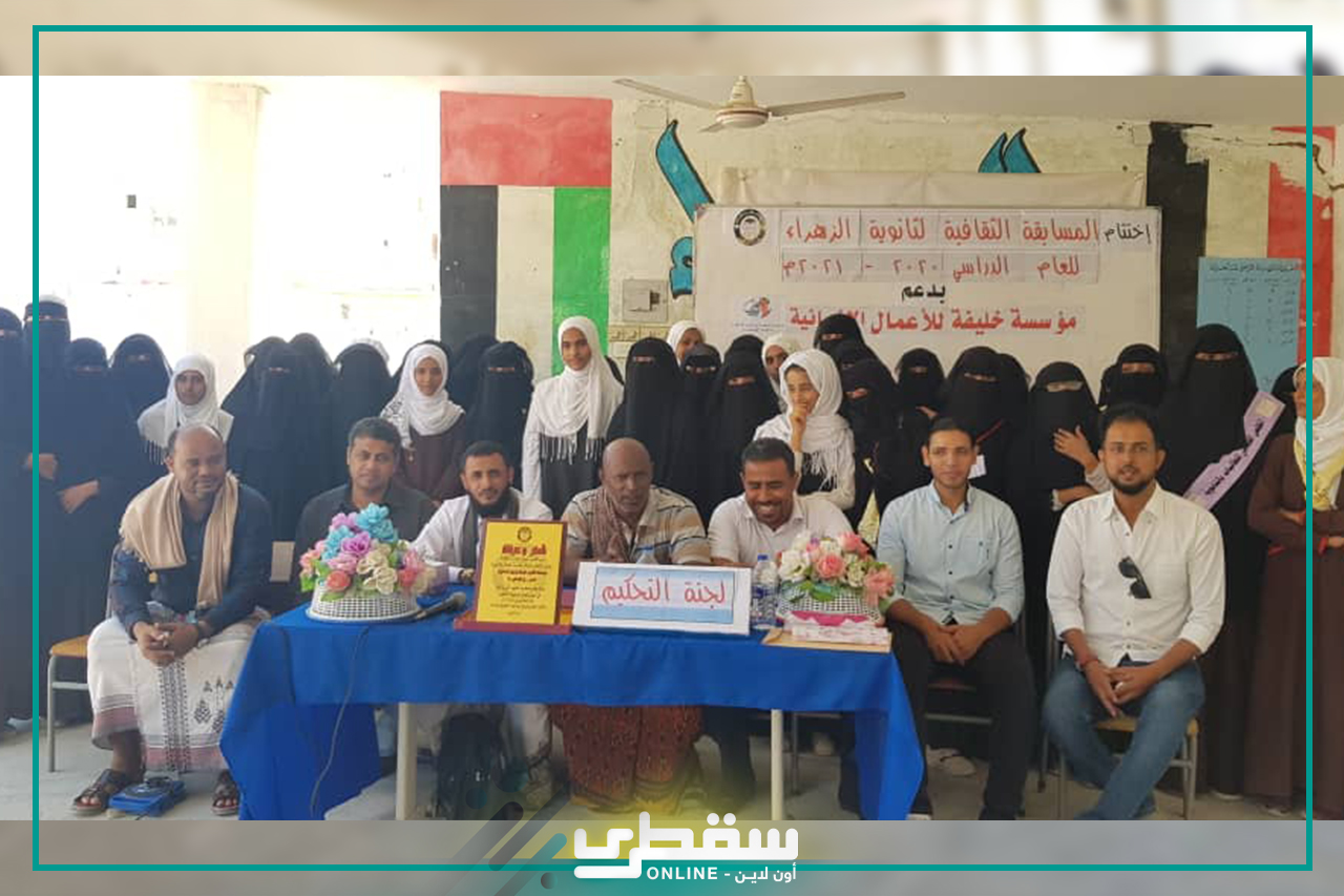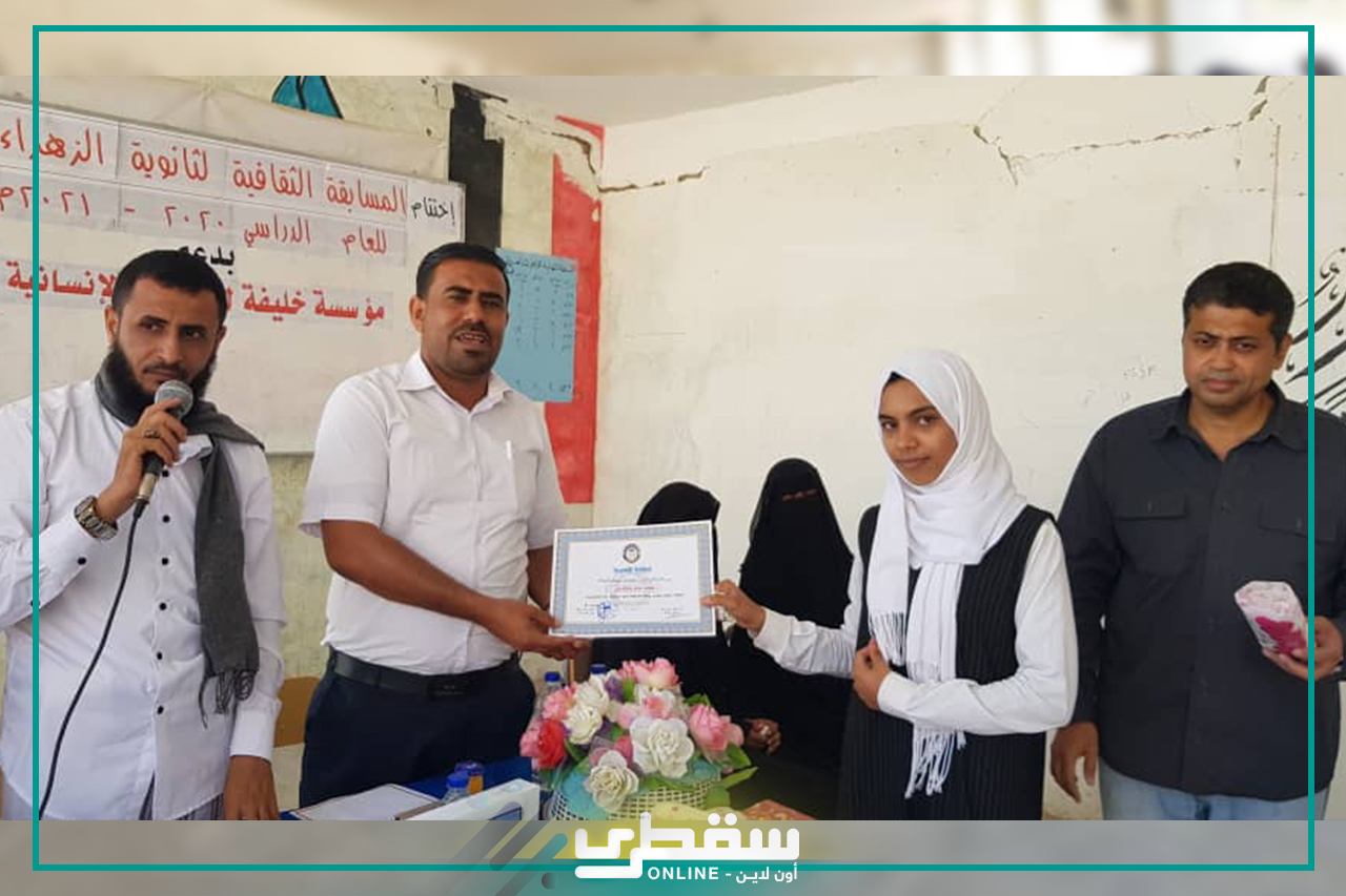 نظمت ثانوية الزهراء للبنات في مديرية حديبو بأرخبيل سقطرى حفلاً أنيقاً كرمت من خلاله الطالبات الفائزات بالمسابقة الثقافية والمنهجية التي نظمتها من 9 الى 11فبراير بدعم من مؤسسة خليفه بن زايد ال نهيان للاعمال الانسانية