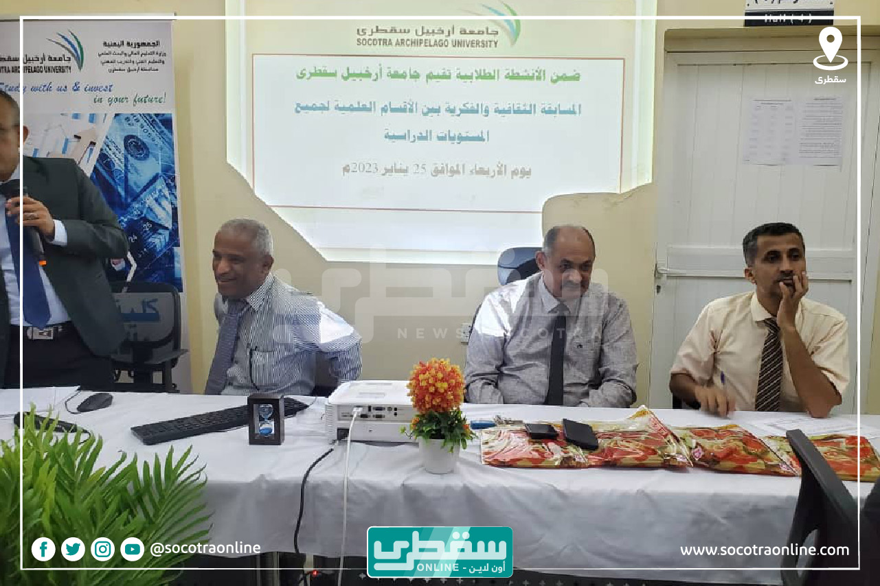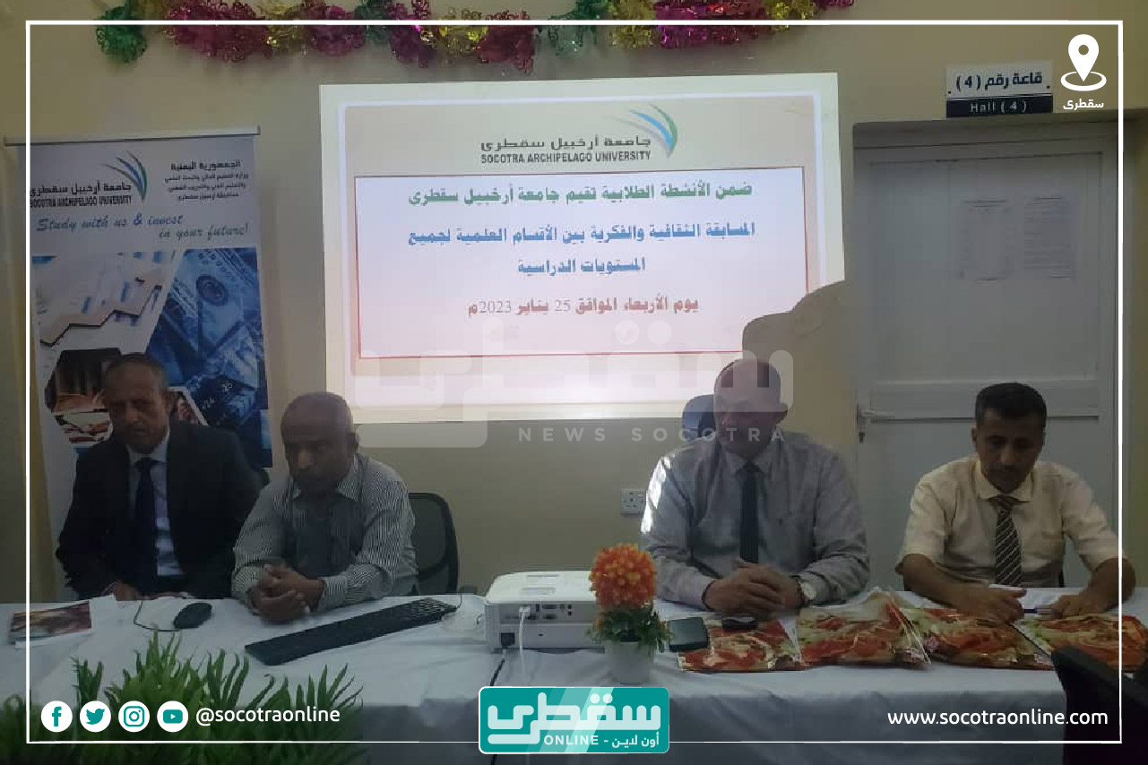 أقامت جامعة أرخبيل سقطرى أمس الأربعاء المسابقة الثقافية والفكرية بين الأقسام العلمية لجميع المراحل الدراسية وذلك تنفيذاً لبرنامج أنشطتها اللاصفية للارتقاء بمستوى طلابها ثقافيا ومواكبة النشاط الطلابي في شتى المجالات بكليات الجامعة.