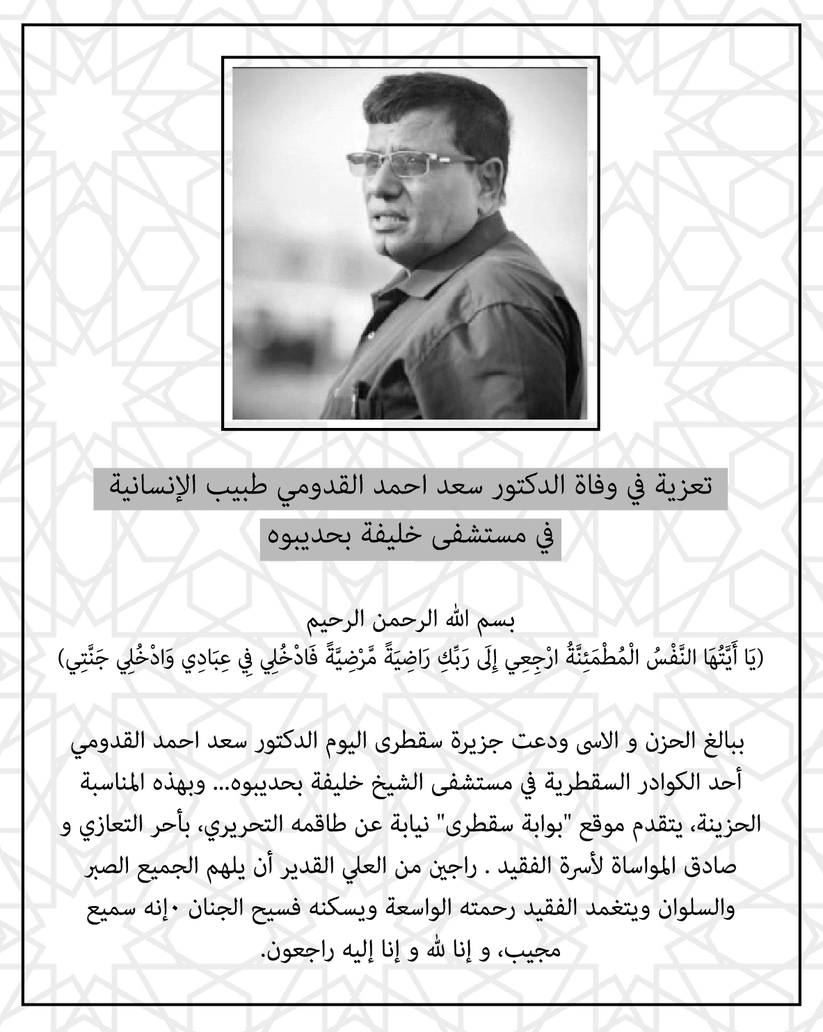 تعزية في وفاة الدكتور سعد احمد القدومي طبيب الإنسانية في مستشفى خليفة بحديبوه