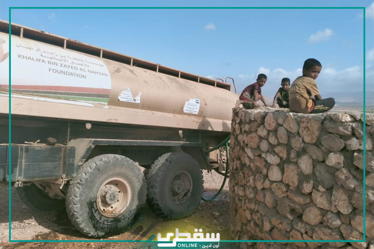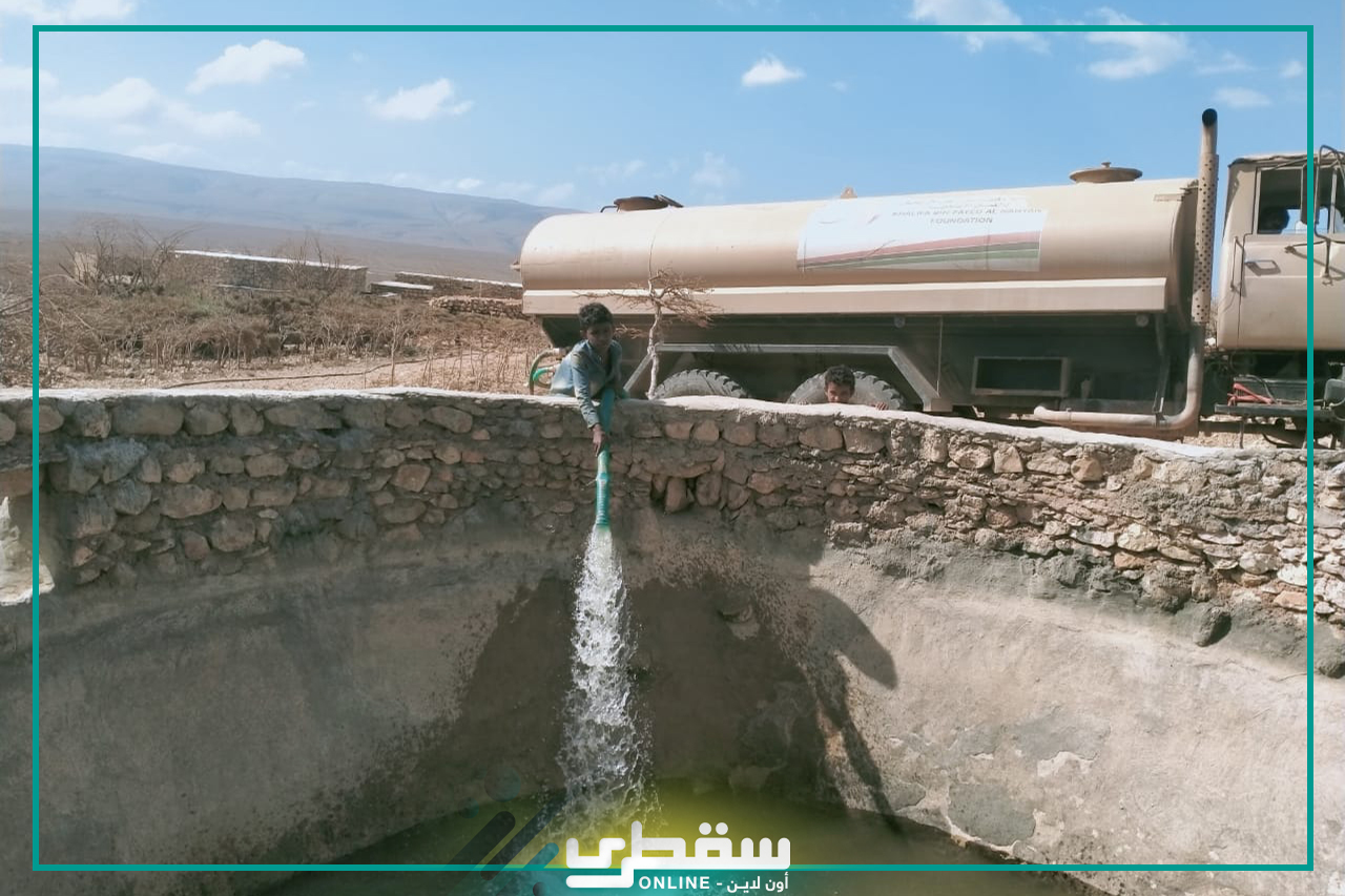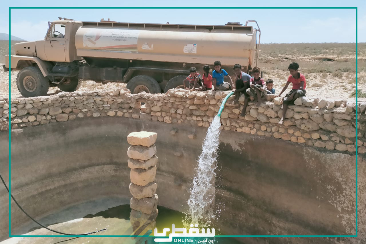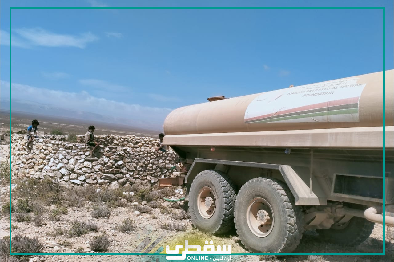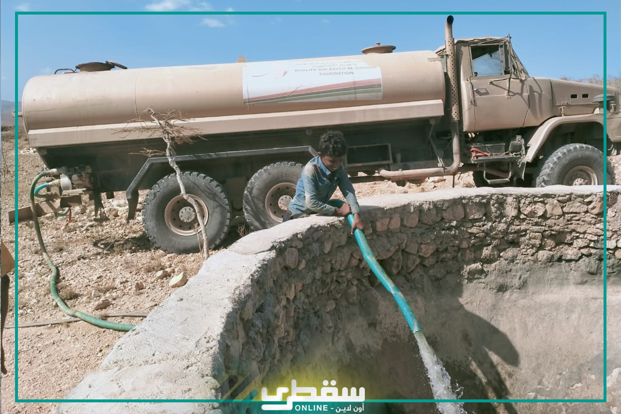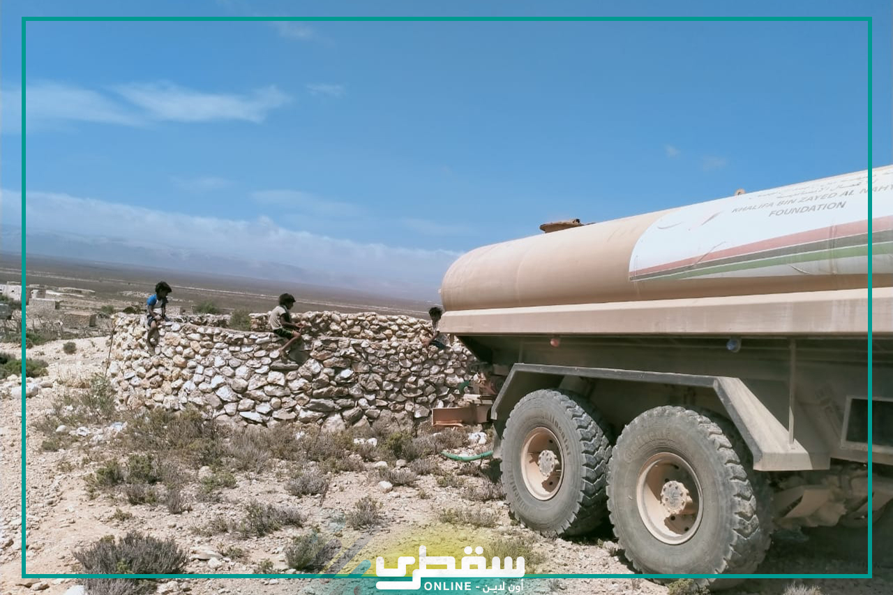 Khalifa bin Zayed Al Nahyan Foundation sent vehicles of potable water tanks to Qabhaten in West Socotra as response to calls of citizens to meet their daily needs of potable water due to lack of rain.